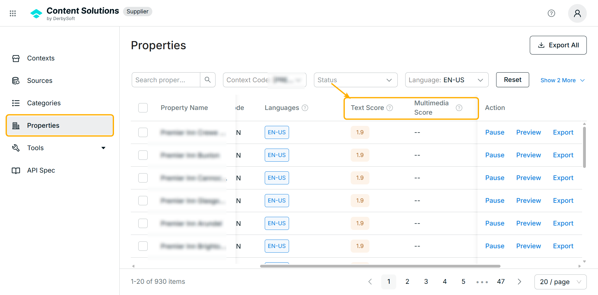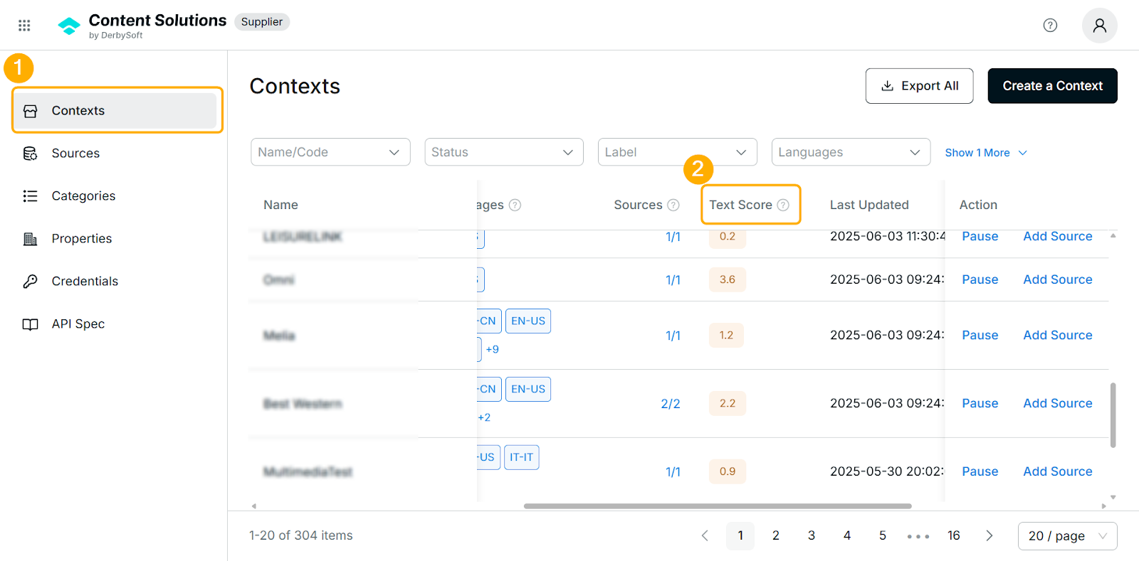 The Text Score—reflecting the overall quality of text content in a context’s primary language—is now visible on the Contexts page.
