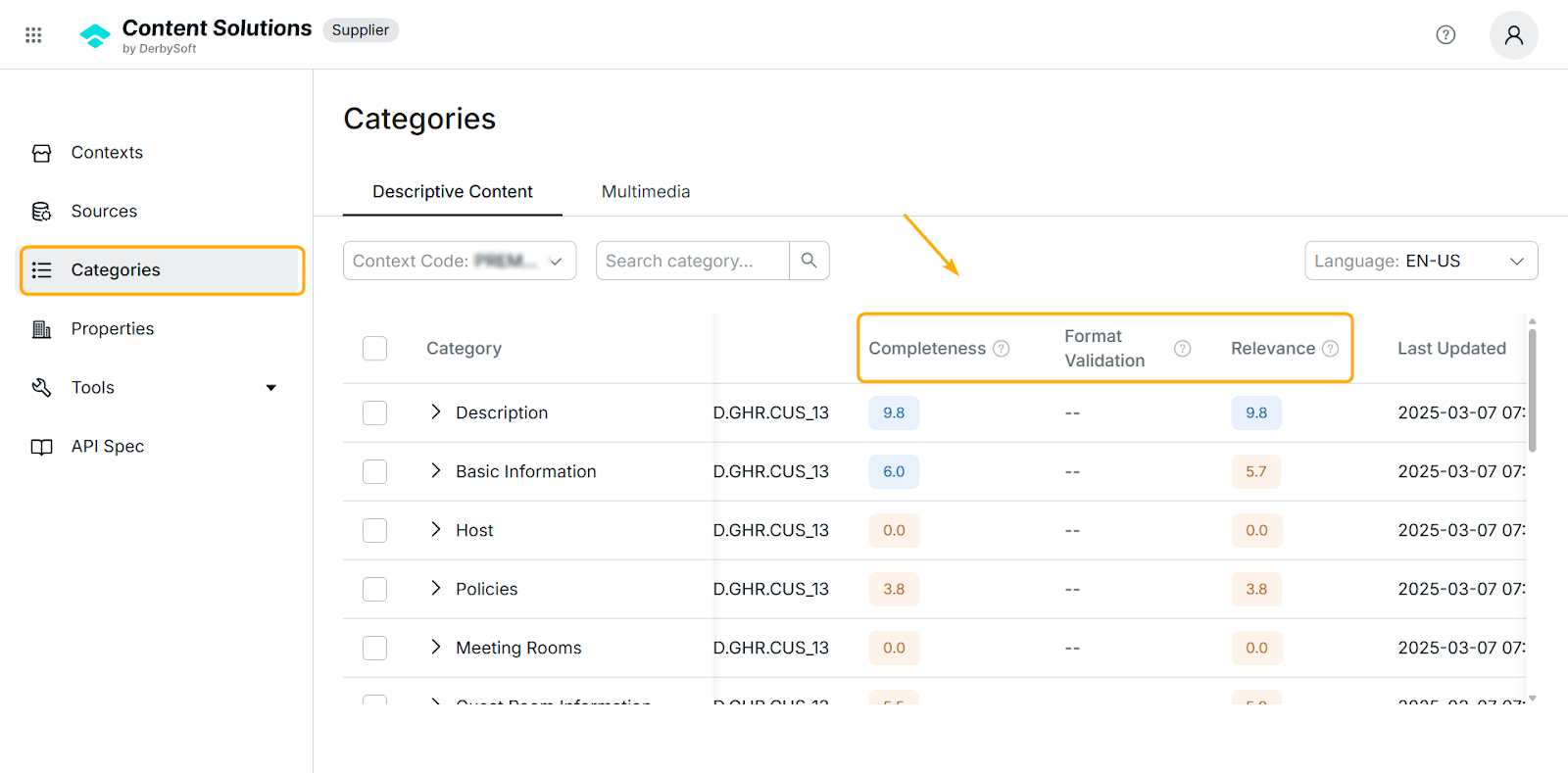 Users can view the following granular scores (scale 1–10, one decimal place) for enabled contexts under each category on Categories page:- Completeness: A score that measures how complete the property category is in regards to descriptive content information.