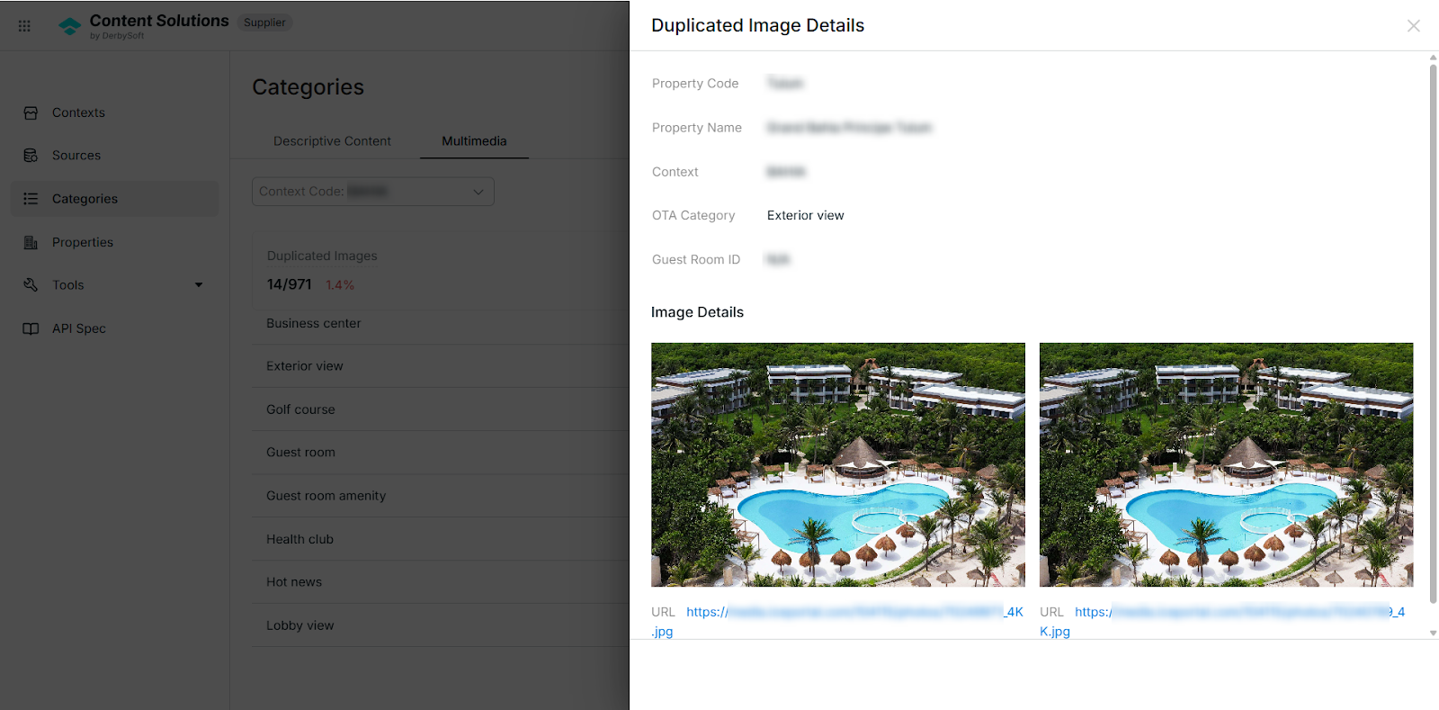 Support users to export detailed lists of duplicate images by clicking the button, including context code, property code, property name, OTA category, guest room ID, duplicated images URLs.